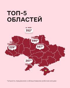 Найактивнішими учасниками програми були роботодавці у Київській області, тут 590 підприємств створили інклюзивні робочі місця для своїх працівників. Також дуже затребуваною є така послуга Служби зайнятості у Черкаській області – 567 та у столиці – 352.