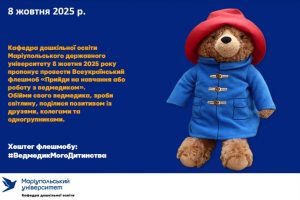 Флешмоб «Прийди на навчання або роботу з ведмедиком» започаткувала Кафедра дошкільної освіти Маріупольського державного університету. Чому саме ведмедик? Бо це символ дитинства, затишку й турботи. А ще – чудовий спосіб подарувати гарний настрій собі та іншим!