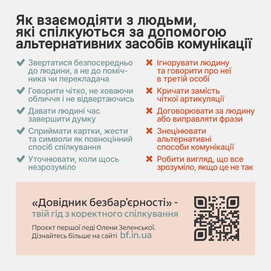 Важливо будувати взаємодію так, щоб співрозмовники відчували повагу, увагу та безпеку, а не поспіх або роздратування. Про етику взаємодії з людьми, які користуються альтернативними засобами комунікації, йдеться в оновленому розділі «Довідника безбар’єрності», створеному в межах ініціативи першої леді Олени Зеленської.