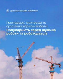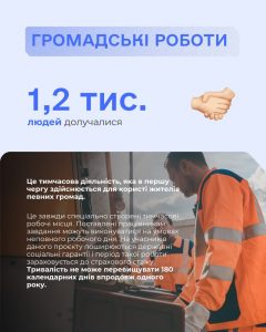 пунктів. Це завжди спеціально створені тимчасові робочі місця. Поставлені працівникам завдання можуть виконуватися на умовах неповного робочого дня. На учасників даного проєкту поширюються державні соціальні гарантії і період такої роботи зараховується до страхового стажу. Тривалість не може перевищувати 180 календарних днів впродовж одного року. За направленнями Державної служби зайнятості 1,2 тисячі людей цього року долучалися до громадських робіт. Найактивнішими були Черкаський та Харківській центри зайнятості.