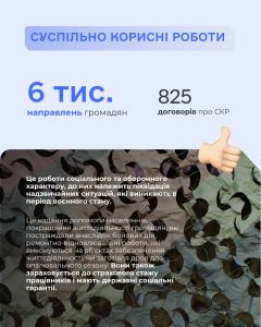 Сил, інших військових формувань та сил цивільного захисту. Це надання допомоги населенню, покращення життєдіяльності громадян, які постраждали внаслідок бойових дій, ремонтно-відновлювальні роботи, які виконуються на об’єктах забезпечення життєдіяльності, чи заготівля дров для опалювального сезону. Замовлення на подібну діяльність робить військове командування спільно з військовими адміністраціями. Такі види робіт є не у всіх областях України. Вони також зараховується до страхового стажу працівників і мають державні соціальні гарантії. За перший місяць цього року з Службою зайнятості укладено 825 договорів про СКР, відповідно до яких здійснено понад 6 тис. направлень громадян на суспільно корисні роботи. Найактивніше ця програма діє в Донецькій, Київській, Полтавській, Сумській та Харківській областях.