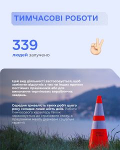 Така зайнятість в Україні організовується найрідше. Замовлення на подібні вакансії також робить місцева влада, так само, як і з громадськими роботами. Проте, цей вид діяльності застосовується, щоб замінити відсутніх з тих чи інших причин постійних працівників або для виконання термінових виробничих завдань. Середня тривалість таких робіт цього року складає лише шість днів. Цьогоріч найчастіше цей вид діяльності застосовувався для оптової та роздрібної торгівлі, ремонту автотранспортних засобів та мотоциклів, для організації харчування та у переробній промисловості. Роботи тимчасового характеру також зараховується до страхового стажу, а працівники мають державні соціальні гарантії. Цього року до такої діяльності залучено 339 людей. Найчастіше таке працевлаштування пропонували Дніпропетровський, Івано-Франківський та Кіровоградський центри зайнятості