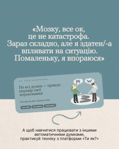 Дізнайся, як можна працювати з думками, щоб зберегти ресурси на розв’язання проблем, а не хвилювання. Забирай техніку «Не всі думки – правда» на платформі «Ти як?».