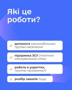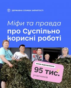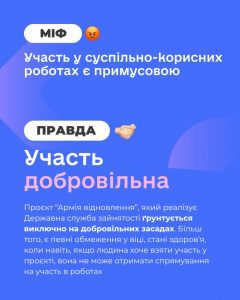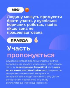 Правда: Державна служба зайнятості пропонує взяти участь у суспільно корисних роботах на добровільних засадах. Учасниками СКР можуть стати як зареєстровані безробітні, так і люди які не мають постійної зайнятості, зокрема це внутрішньо переміщені, ветерани чи ветеранки або ж люди пенсійного віку (до 70 років) та самі проявляють ініціативу долучитися до «Армії відновлення».