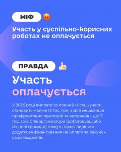 Правда: Оплата робіт здійснюється за кошти Фонду загальнообов’язкового державного соціального страхування України на випадок безробіття. У 2026 році виплата за повний місяць участі становить майже 13 тис. грн, а для мешканців прифронтових територій та ветеранів – до 17 тис. грн. Співорганізатори (роботодавці або місцеві громади) можуть також виділяти додаткове фінансування на оплату за рахунок своїх бюджетів.