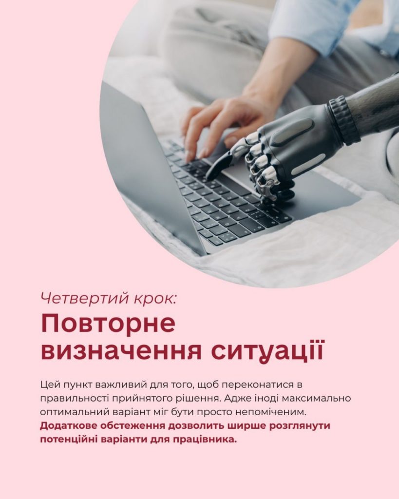 Четвертим кроком буде – повторне визначення ситуації. Цей пункт важливий для того, щоб переконатися в правильності прийнятого рішення.