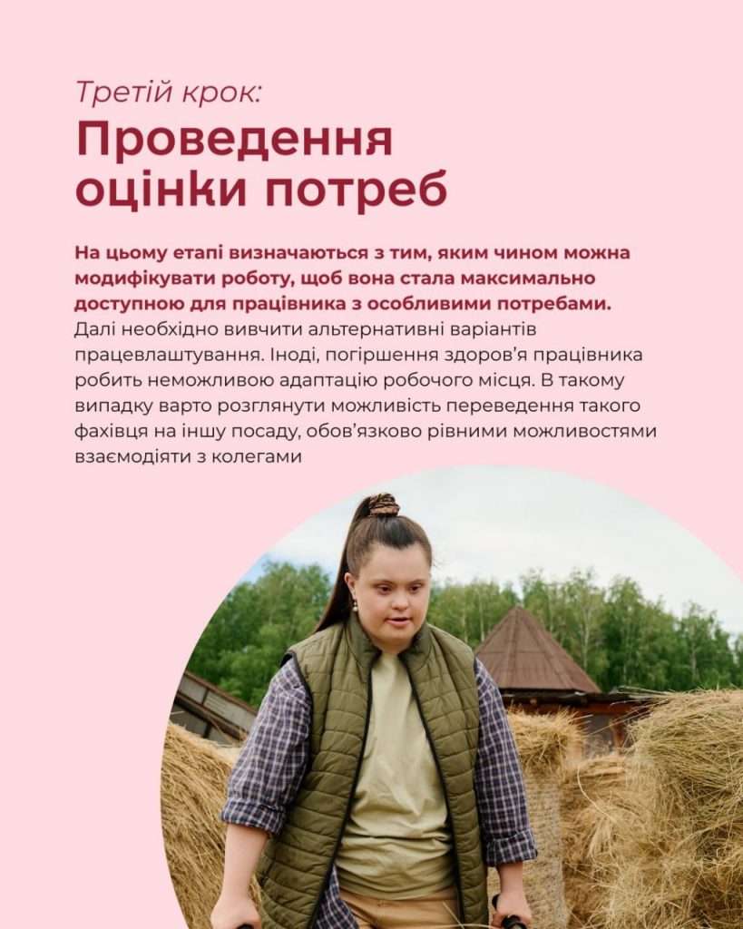 Наступний етап – проведення оцінки потреб. На цьому етапі визначаються з тим, яким чином можна модифікувати роботу, щоб вона стала максимально доступною для працівника з особливими потребами. В цей час важливо усвідомити чи потрібно загалом змінювати систему правил підприємства. На цьому етапі роботодавцю може знадобитися допомога з надання кваліфікованого перекладача, послуги із перекладу шрифту Брайля або із відеозйомки для створення навчальних фільмів, проведення ергономічної оцінки чи стану виробничої гігієни.