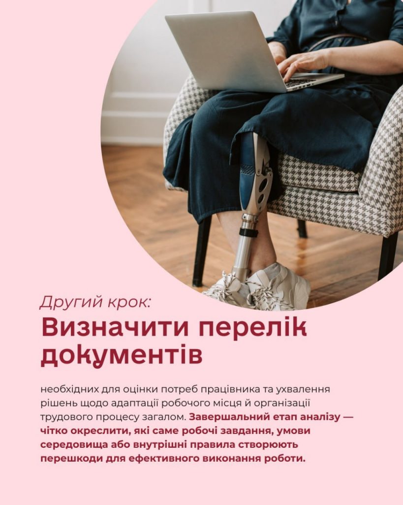 Наступний крок – визначити перелік документів, необхідних для оцінки потреб працівника та ухвалення рішень щодо адаптації робочого місця й організації трудового процесу загалом.