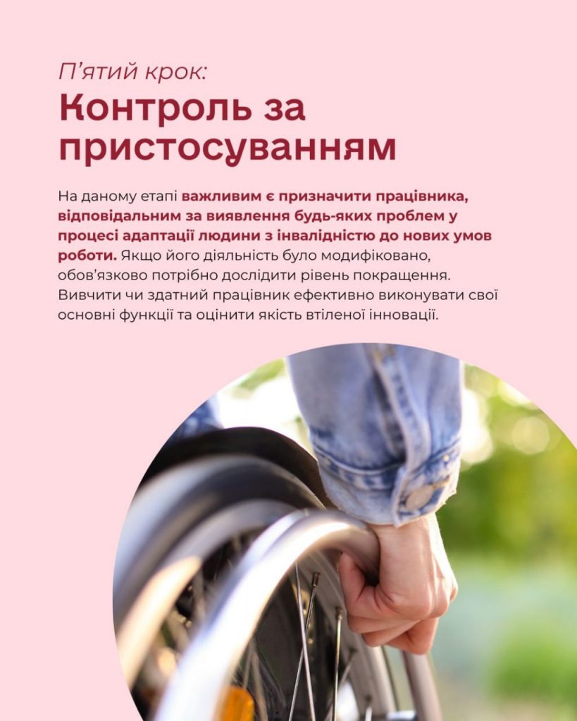 Останній крок – контроль за пристосуванням. На даному етапі важливим є призначити працівника, відповідальним за виявлення будь-яких проблем у процесі адаптації людини з інвалідністю до нових умов роботи. Якщо його діяльність було модифіковано, обов’язково потрібно дослідити рівень покращення.
