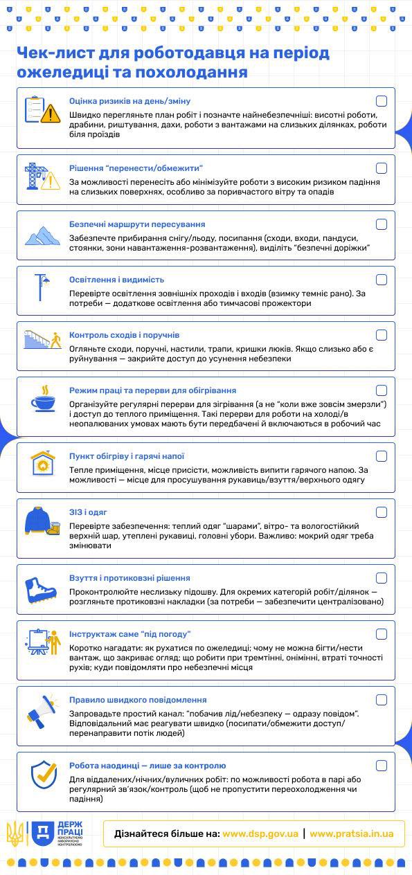 Для зручності роботодавців підготовлено чек-лист дій на період ожеледиці та похолодання — зверніть на нього увагу (на інфографіці).