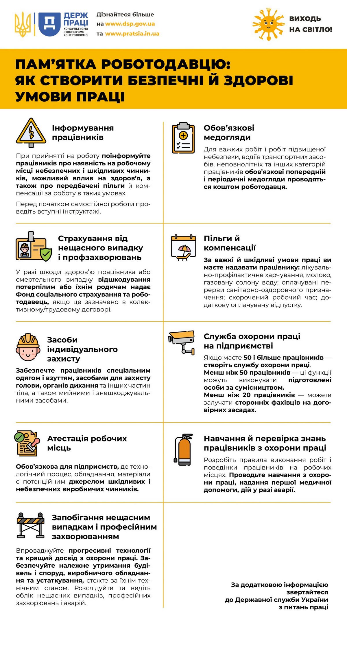 Ознайомитися з «Пам’яткою роботодавцю: як створити безпечні й здорові умови праці» за посиланням: https://dsp.gov.ua/podolannia-nelehalnoi-zainiatosti/pamiatka-robotodavtsiu-iak-stvoryty-bezpechni-i-zdorovi-umovy-pratsi/