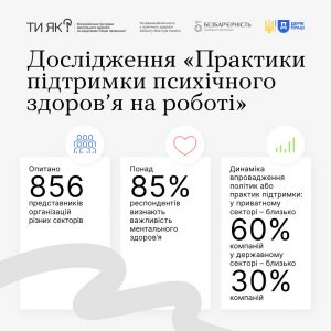 Понад 85% українських компаній визнають важливість ментального здоров’я, але лише частина впроваджує реальні дії. Такими є результати дослідження «Практики підтримки психічного здоров’я на роботі», проведеного Координаційний центр КМУ / Mental Health UA, ГО Безбар’єрність спільно з Державна служба України з питань праці у межах Всеукраїнської програми ментального здоров’я Ти як? – ініціативи першої леді Олени Зеленської.