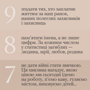 А ти зробиш одну маленьку та дуже цінну дію. Шануй себе і шануй тих, хто загинув.